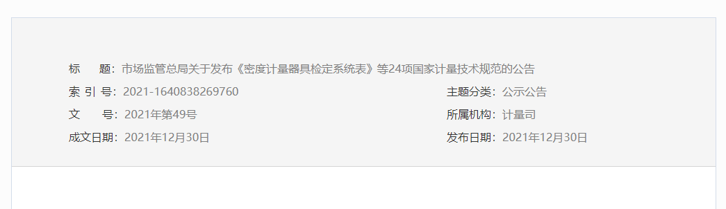 近日,市場監管總局關于發布《密度計量器具檢定系統表》等24項國家計量技術規范的公告: