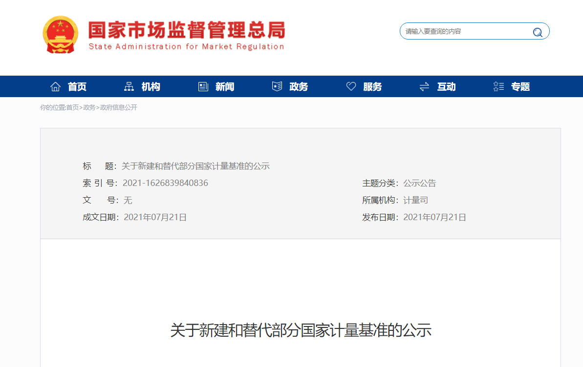 市場監管總局發布關于新建和替代部分國家計量基準的公示