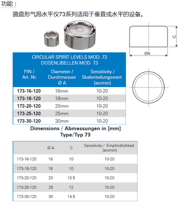 73系列圓盤形氣泡水平儀,適用于垂直或水平的設備。