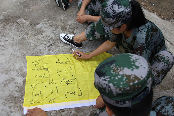 初秋天朗,驕陽未消。在拓展任務開始之前,教官將我們分成4支隊伍后,各隊討論推選出隊長,并設計隊名、隊旗、隊歌和展現各隊別具特色的口號。全部完成后,為期兩天的團隊之旅、挑戰之旅、感恩之旅正式開始。