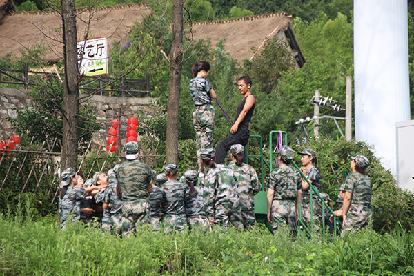 男隊員主動擔任底座,用自己的肩膀、大腿為其他隊員豎起一座通往勝利的人梯;已經翻越的同事緊緊抓住下面隊員的手臂,拼盡全力;等待翻越的隊員伸出自己的雙手,時刻準備著為其他隊員提供保護。同時有條不紊地向上攀登著。時間一分一秒的過去,隊員們也一個一個翻越了畢業墻。14分23秒,全部隊員翻越完畢,代表著我們的拓展訓練順利畢業了。
